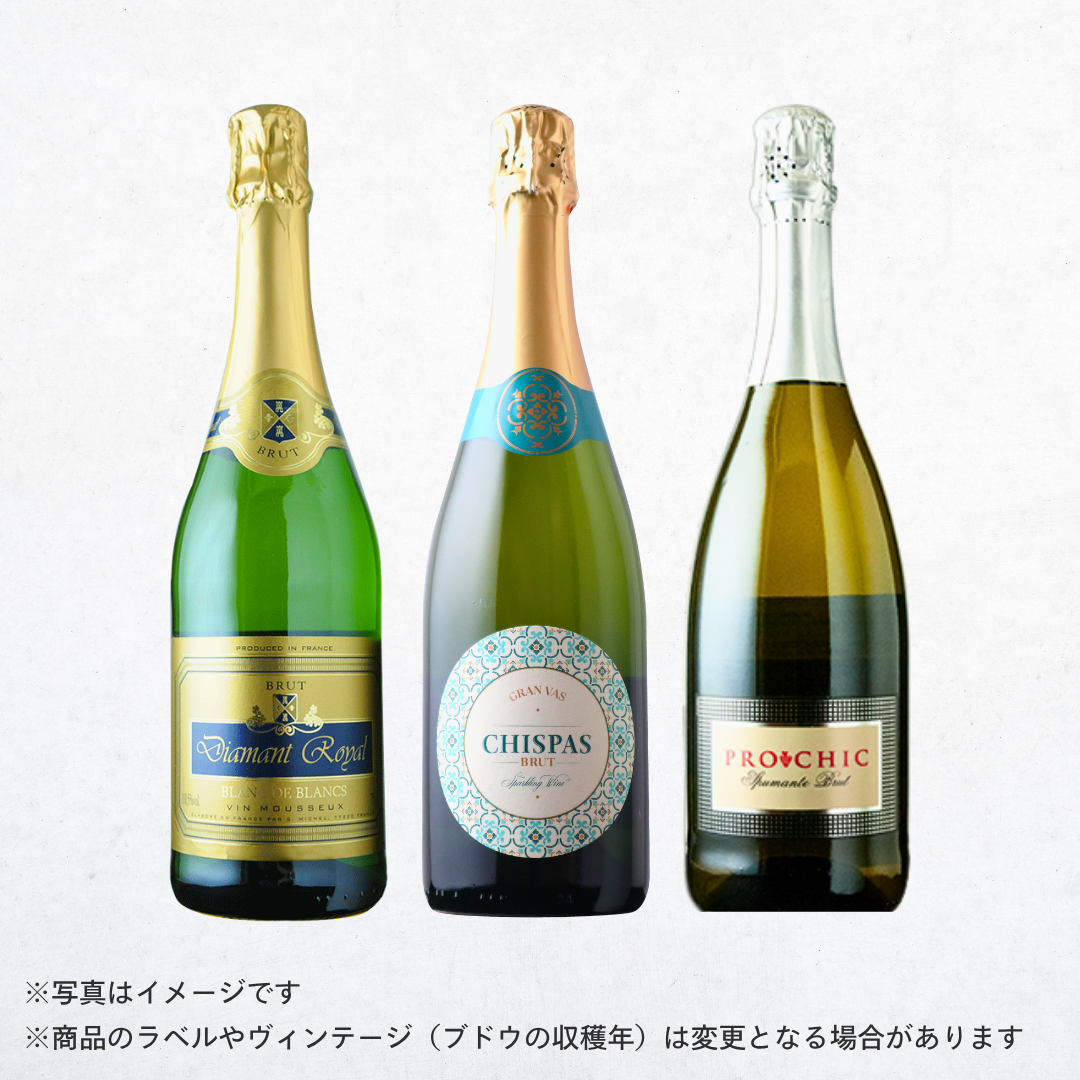 華やかなひとときを彩る、フランス・イタリア・スペインのスパークリングワイン3本セット。いずれも辛口タイプで、料理との相性も抜群。日常の乾杯から特別なギフトまで幅広くお楽しみいただけます。