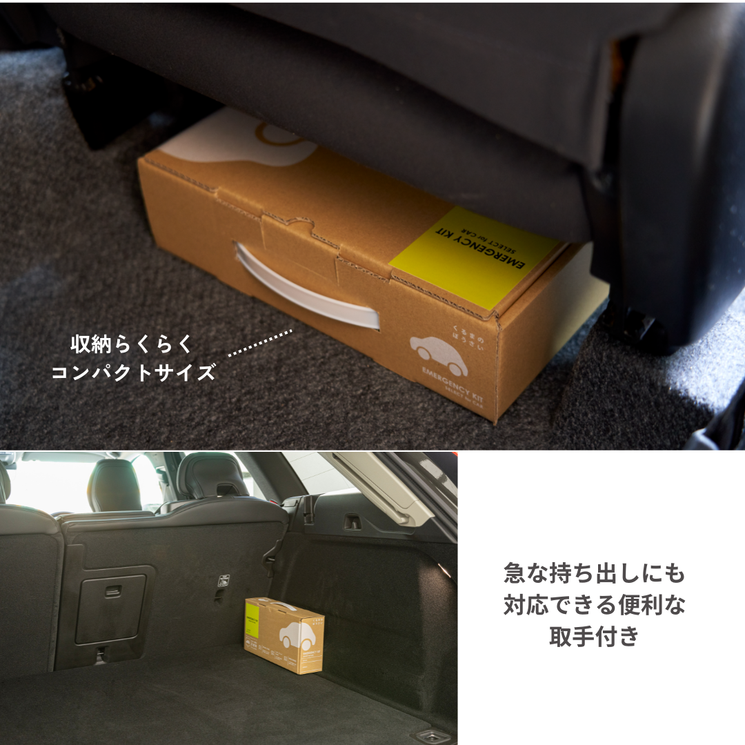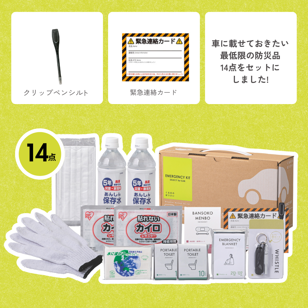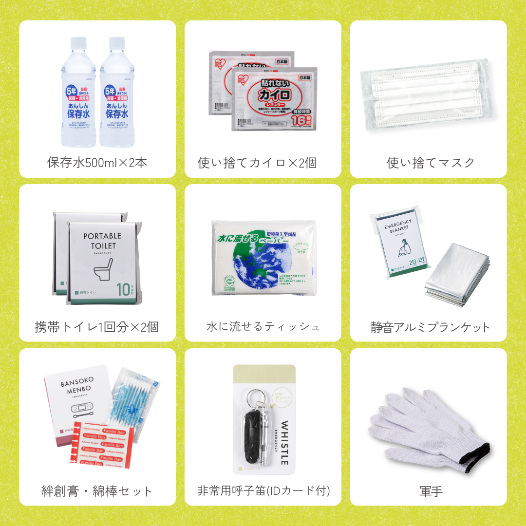 軍手、携帯トイレ(1回分) ×2個、絆創膏・綿棒セット、保存水500ml×2本、使い捨てカイロ×2個、水に流せるポケットティッシュ、使い捨てマスク、非常用呼子笛(IDカード付)、静音アルミブランケット、緊急連絡カード、クリップペンシル(キャップ付き)
