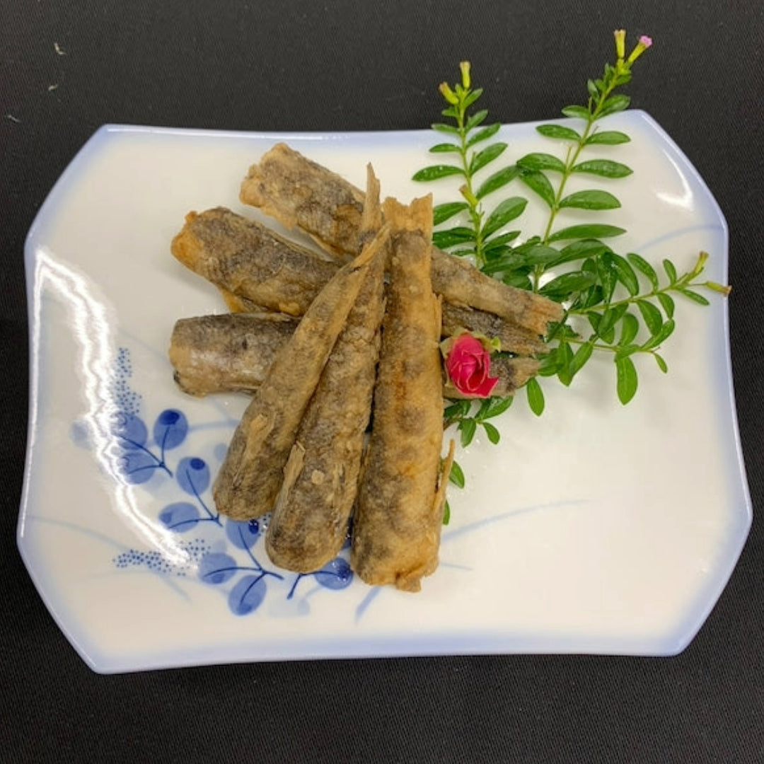 蒲郡の名物めひかりの唐揚げ。蒲郡は小中学校の給食にも出るお子さんにも人気の魚で、居酒屋でもお父さんたちが酒の肴に召し上がるご当地グルメです。