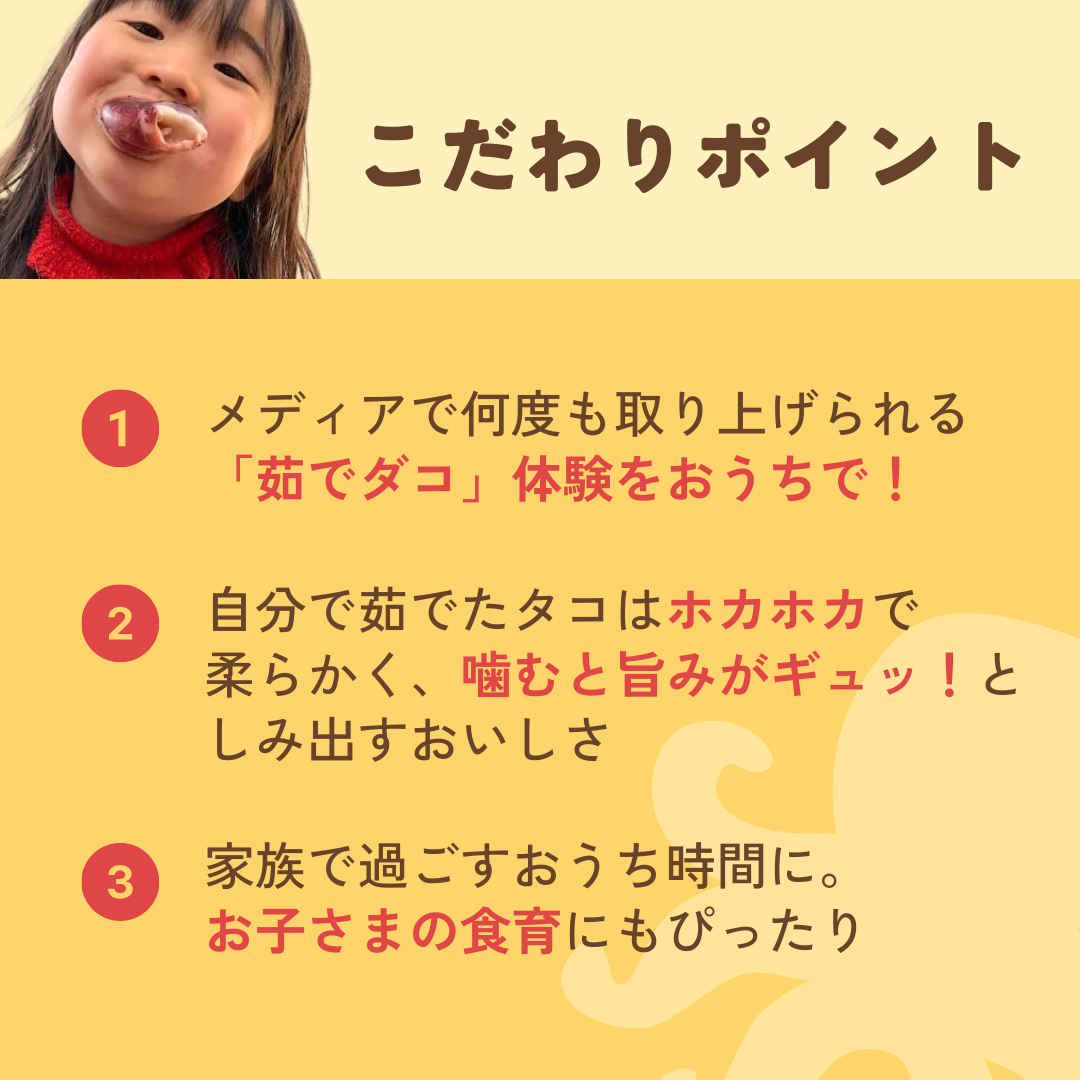 こどもの食育にも、ご家族でお家時間を楽しむコンテンツとしても魅力的だなと思ってセレクトさせていただいた商品です。先日親子で挑戦したところ、最初は気持ち悪い・・・と及び腰だった息子(7歳)も「ここがタコの口で、ここが胴体なんだ!」などと言いながらだんだんと前のめりに。タコの足をお湯につけるとすぐにくるんと丸まる様子には親子ではしゃいでしまいました。自分で茹でたタコはホカホカで柔らかく、噛むと旨みがぎゅっと口の中に広がります。学べて、美味しくて、楽しい商品をぜひお試しください。