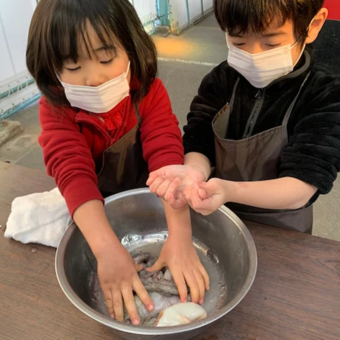 生のタコを触ったことがないお子さんは「ぬめぬめで気持ち悪い~!」なんて言いながら、どろんこ遊びのように集中してぬめりを取ってくれる子が多いんです。