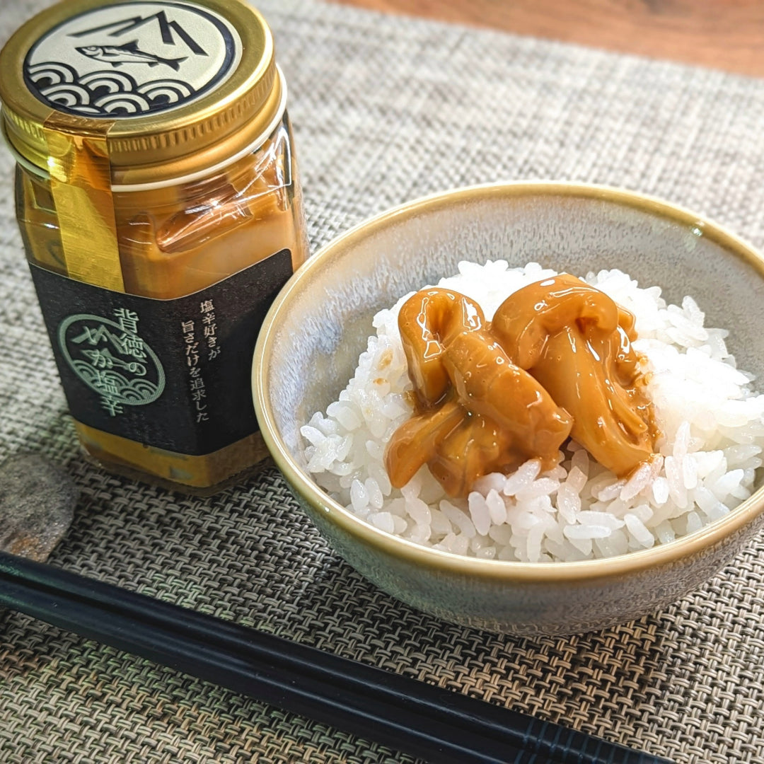 夫婦で晩酌、日本酒のアテに塩辛をちょっとずつ食べるのも背徳感があってオススメなんですが、結構濃厚なので、炊きたてのご飯の上に「背徳のいか塩辛」をのせて食べていただきたいです。
