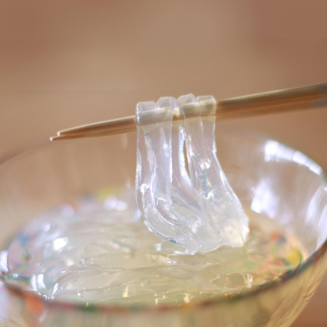 透明な器にところてんを盛ると、「え?中身はどこ?」と目を疑うほどの透明さ。2日間かけてじっくり丁寧につくる透明すぎるところてんは、つるんとのどごしが良く、雑味のない味です。