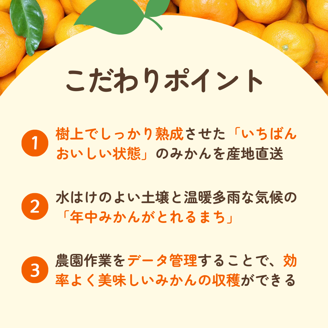 樹上完熟のみかんだからこそ、甘味と柑橘本来の酸味のバランスがよくて、みずみずしい美味しさをしっかりとご実感いただけるはず。美味しさを最優先に、ひとつひとつの熟度を見極めて丁寧に育てたみかんをお届けします。