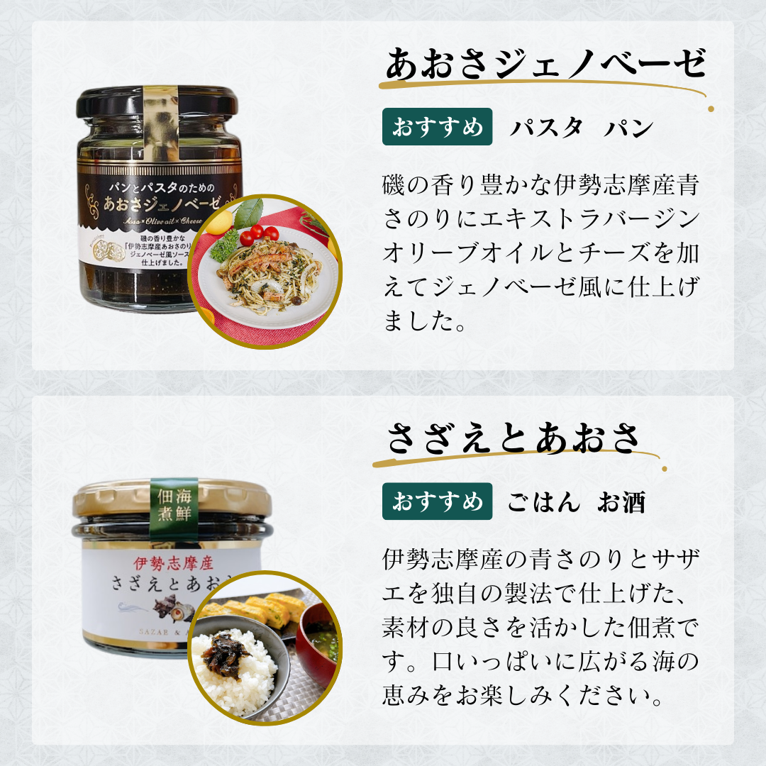 磯の薫り豊かな「伊勢志摩産青さのり」を使用し、エキストラバージンオリーブオイルとチーズなどでジェノベーゼ風に仕上げました。パンとパスタにおすすめのソースです。化学調味料不使用で新商品になります。 |