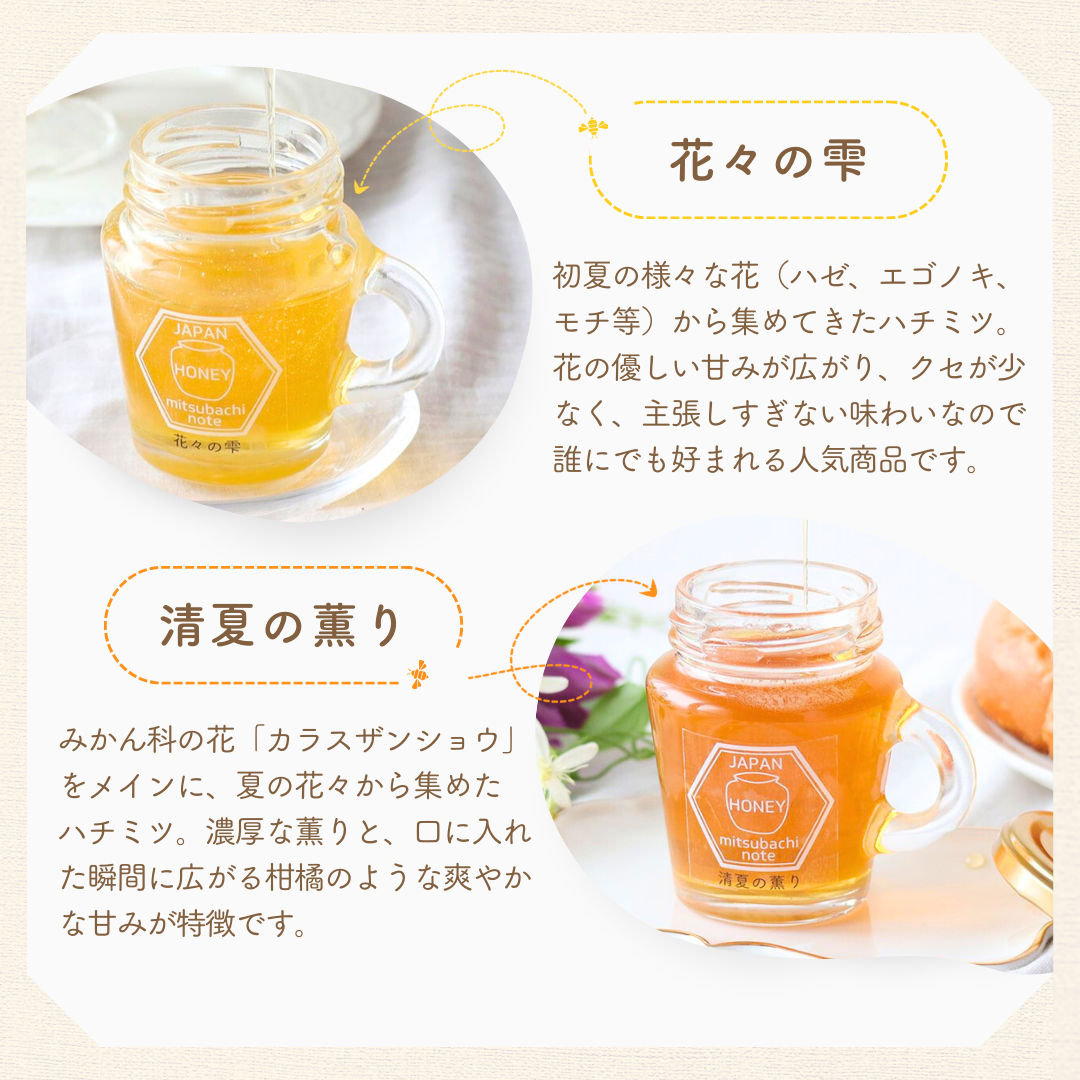初夏の様々な花(ハゼ、エゴノキ、モチ)から集めてきたハチミツです。花の優しい甘みが広がり、クセが少なく、主張しすぎない味わいです。みつばちのーとのハチミツの中で一番クセが少なく、誰にでも好まれる人気商品です。