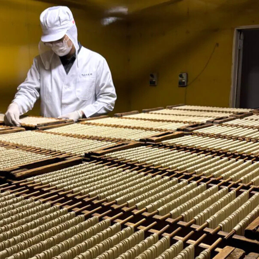 また、乾燥室では熱を一切加えず送風だけで乾燥させます。それにより、麺から出る潜熱を利用して温度と湿度を調整し、芯の水分と表面の水分をしっかり飛ばすため、60時間ゆっくりじっくり時間をかけて乾燥させるこだわりです。