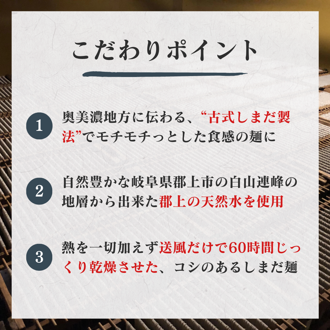 ゆっくり時間をかけて乾燥させたしまだ麺は、賞味期限も長くなり、茹で戻した際に、たっぷりのお水を吸うので、つるっとした食感に比べ、モチモチっとしたコシのある食感を味わえるのが特徴です。