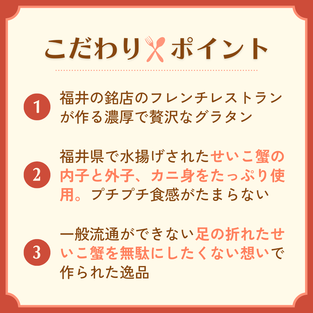 県民に愛されるせいこがにを無駄にしたくない。手を汚さずにもっと簡単にせいこがにを味わえないか。と想い作ったのが『越前せいこ蟹のグラタン』です。