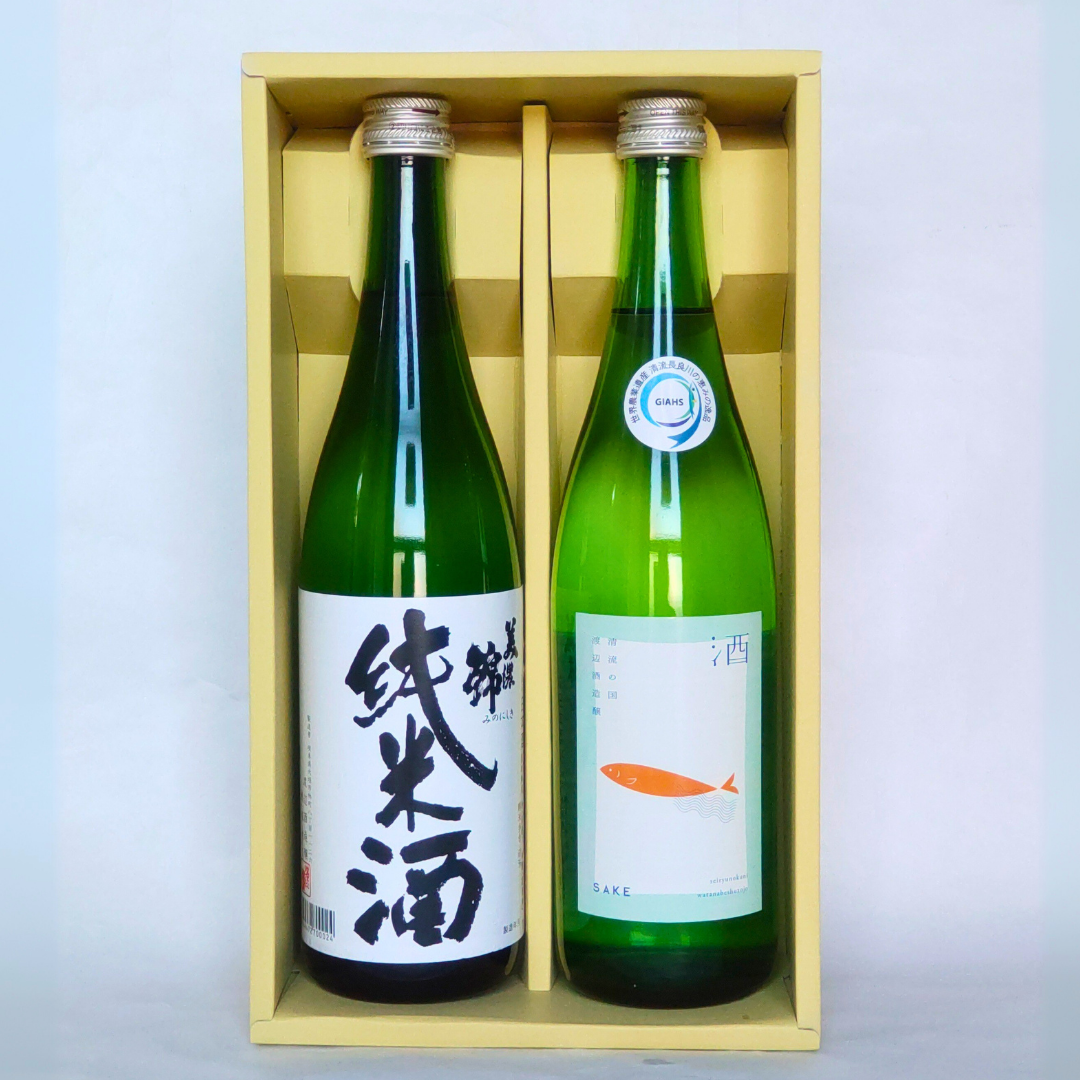 渡辺酒造醸こだわりの日本酒の中から、鮎の甘露煮など旨い味わいによりそう「清流の国 純米」と、優しく穏やかな口あたりの「美濃錦 純米」をセットにしてお届けします。口あたり良くお米の旨味や甘みを感じる純米酒。冷やしてもぬる燗でも美味しくいただけます。