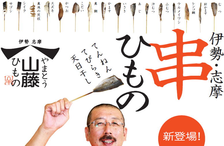 三重県南伊勢町で串ひものを販売する山藤(やまとう)です。魚離れが進む中で、南伊勢で獲れる美味しい魚を手軽に味わってもらいたいと思い生み出したのが、この焼き串ひもの。