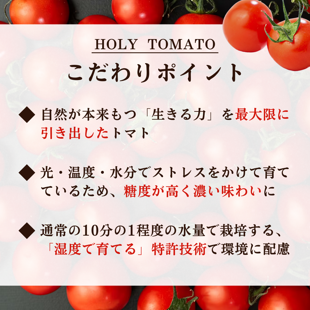 新しい栽培方法で育てた「HOLY TOMATO(ホーリートマト)」を通じて、食卓に笑顔と心身が健康になることを願い、これからも愛情を込めて、1つ1つのトマトをお届けいたします。栄養豊富で抜群の美味しさをぜひご家族みなさまで味わっていただけると嬉しいです。